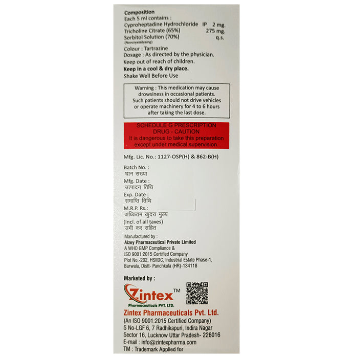 Composition : Cyproheptadine (2mg/5ml) + Tricholine Citrate (275mg/5ml) + Sorbitol (70%)