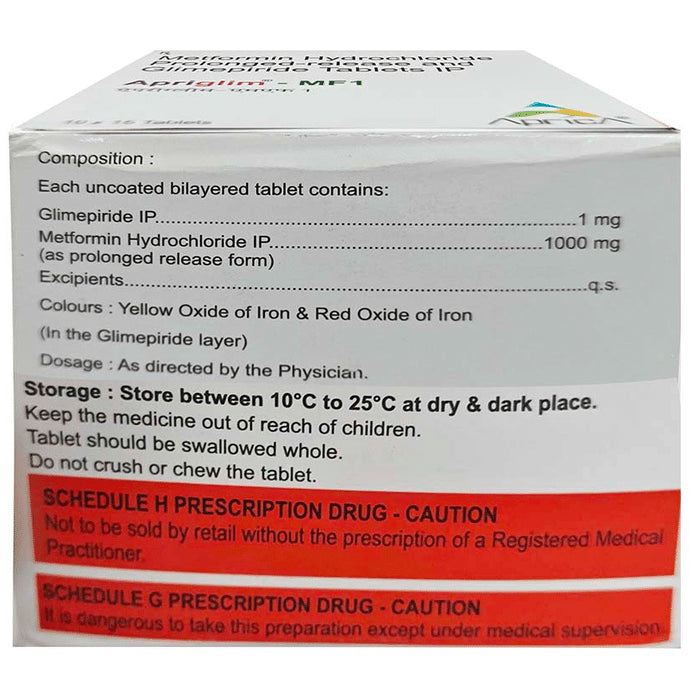 Apriglim-MF 1 Tablet PR belongs to a category of medicines known as anti-diabetic drugs. It is a combination of two medicines used to treat type 2 diabetes mellitus in adults. It helps control blood sugar levels in people with diabetes. Apriglim-MF 1 Tablet PR should be taken with food. Take it regularly at the same time each day to get the most benefit. Your doctor will decide what dose is best for you and this may change from time to time according to how it is working according to your blood sugar levels.Keep taking this medicine, even if you feel well or your blood sugar levels are controlled. If you stop it without consulting your doctor, your blood sugar levels could rise and put you at risk of kidney damage, blindness, nerve problems, and loss of limbs. Remember that it is only part of a treatment program that should also include a healthy diet, regular exercise, and weight reduction as advised by your doctor. Your lifestyle plays a big part in controlling diabetes.The most common side effect of Apriglim-MF 1 Tablet PR is low blood glucose levels (hypoglycemia). Make sure you recognize the signs of having low blood glucose levels, such as sweating, dizziness, headache, and shaking, and know how to deal with it. To prevent this, it's important to have regular meals and always carry a fast-acting source of glucose such as sugary food or fruit juice with you. Drinking alcohol can also increase your risk of low blood sugar levels and should be avoided. Other side effects that may be seen on taking this medicine include taste changes, nausea, diarrhea, stomach pain, headache, and upper respiratory tract infection. Some people may find that they put on weight with this medicine.You should not take it if you have type 1 diabetes mellitus, if you have diabetic ketoacidosis (high levels of acid in your blood), or if you have severe kidney or liver disease. Before taking this medicine, tell your doctor if you have ever had heart disease. It may not be suitable. Pregnant or breastfeeding women should also consult their doctor before taking it. Your blood sugar levels should be checked regularly and your doctor may also advise blood tests to monitor your blood cell counts and liver function.