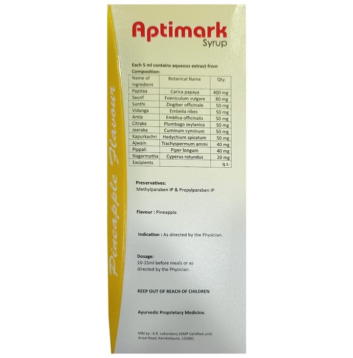 Aptimark Syrup Pineapple Sugar FreeIt is a herbal solution that might enhance appetite and digestion. It helps relieve loss of appetite and indigestion.