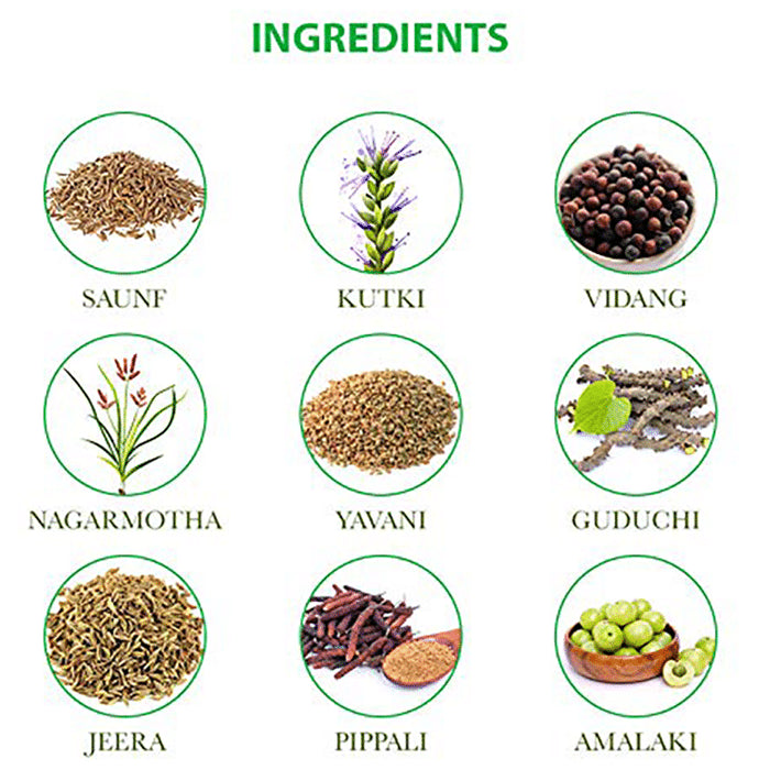 Composition : Giloy (guduchi) (tinospora cordifolia) stem ext.: 75 mg, saunf (foeniculum vulgare) fruit ext.: 37.5 mg, kutki (picrorhiza kurroa) root ext.: 37.5 mg, vidang (embelia ribes) fruit ext.: 18.75 mg, nagarmotha (cyperus rotundus) root ext.: 18.75 mg, jeera (cuminum cyminium) fruit ext.: 18.75 mg, pippali (piper longurn) fruit ext.: 18.75 mg, amalaki (emblica officinalis) fruit ext.: 18.75 mg and yavani (trachyspermum ammi) fruit ext.: 18.75 mg