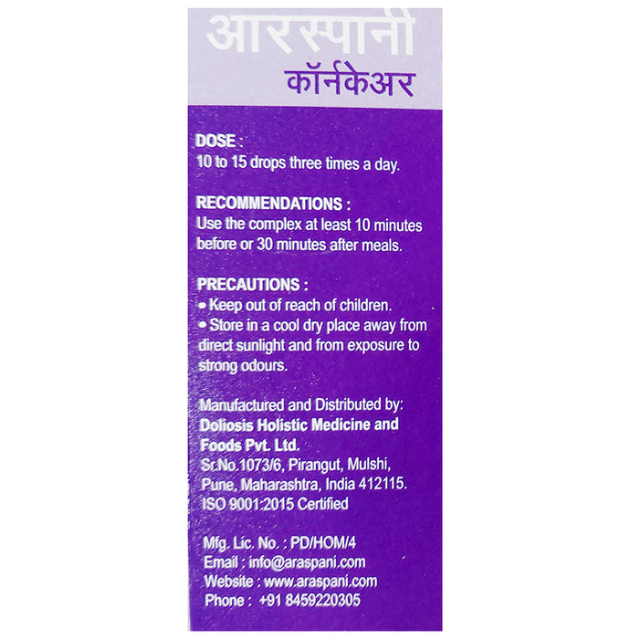 Araspani Corncare Liquid Drops is a homoeopathic preparation crafted with a blend of ingredients, including Graphites, Thuja Occidentalis, and Acid Nitricum. This formulation is designed to help support the body’s natural processes in addressing concerns related to corn formation and skin health. With its unique combination of ingredients, it may help maintain skin comfort and manage minor irritations. This Liquid Drops offers a gentle and holistic approach, aligning with the principles of homoeopathy to promote overall wellness.
