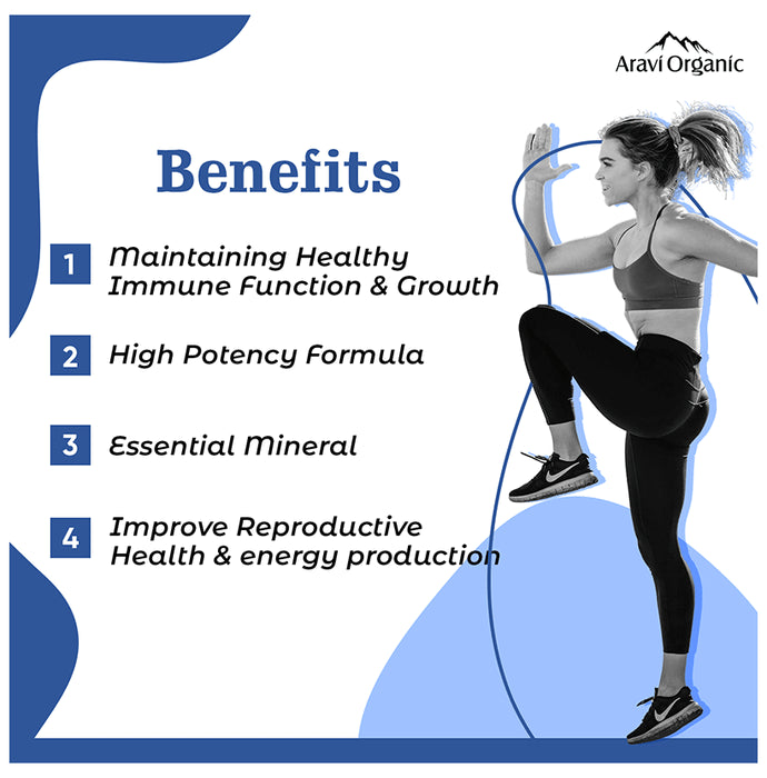 Aravi Organic Zinc with Folic Acid Tablet is a great health supplement that helps strengthen the natural defence of the body. It is rich in antioxidants which provide improvement to mental health, vision and bone growth. It is a powerhouse that provides energy to the body and also works in improving reproductive health.