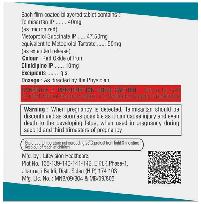 Composition : Cilnidipine (10mg) + Metoprolol Succinate (50mg) + Telmisartan (40mg)