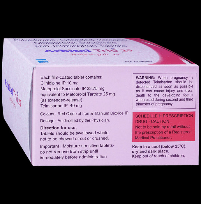Arbitel-Trio 25 Tablet ER is a combination of medicines used to treat hypertension (high blood pressure) when a single medication is not effective. It helps to lower high blood pressure thus reduces chances of future heart attack and stroke. You can take Arbitel-Trio 25 Tablet ER at any time of day, with food, but it is best to take it at the same time each day. Keep taking it for as long as advised by your doctor. Even if you feel well, do not stop this medicine on your own because high blood pressure often has no symptoms. If you stop taking it, your condition may get worse. Keeping active with regular exercise, reducing your weight and eating a healthy diet will also help control your blood pressure. Follow your doctor’s advice while taking this medicine.It may cause side effects like nausea, taste change, throat infection, back pain, and ankle swelling. To lower down ankle swelling, raise your legs while sitting. It is also advised to avoid the intake of potassium rich diet or supplements while on treatment. You may be asked for regular monitoring of blood pressure, kidney function, blood sugar level, and electrolytes level while on the treatment.Before taking it, let your doctor know if you have any liver or kidney problems. Pregnant or breastfeeding women should also consult their doctor for advice before taking this medicine. You also need to tell your doctor what other medicines you are taking especially those used to treat high blood pressure or heart conditions.