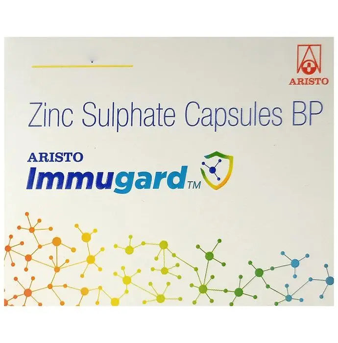 Aristo Immugard Capsule is a nutritional supplement with zinc as its active ingredient. It can help enhance immune function and manage zinc deficiency. Zinc has powerful antioxidant properties and provides multiple health benefits. Key Ingredients: Zinc sulphate I.P Benefits: Zinc supports normal development and function of cells|It may help reduce inflammation and speed up wound healing|It can help improve eye, skin and heart health|Its antioxidant properties can help reduce oxidative stress Direction: Use as directed on the label This capsule has zinc as its main ingredient|It can help boost immunity|It may help improve eye, skin and heart health