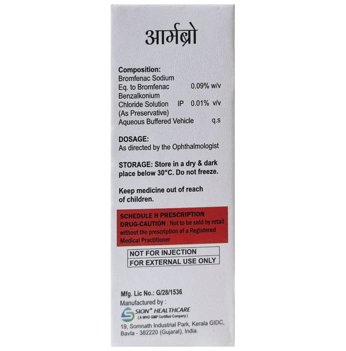 Armbro Eye Drop is a pain-relieving medicine. It is used to treat postoperative eye pain and inflammation in patients who have undergone cataract surgery. Always wash your hands before using Armbro Eye Drop. Use only the number of drops that your doctor has prescribed and wait for about five minutes between each drop. If you wear contact lenses, remove them before using the drops and wait for at least 15 minutes before putting them back in. You should not touch the tip of the dropper or bottle. This may lead to infection.Use of the medicine may cause blurred vision, increased sensitivity to light, change in color vision, decreased vision, eye pain, sore eyes, teary eye, and headache. These are usually temporary and resolve with time. However, if they persist or get worse, you should let your doctor know. Your doctor may be able to suggest ways of preventing or reducing the symptoms.Before using this medicine, you should tell your doctor about all the other medicines you are taking. You should also tell your doctor if you have any other medical conditions or disorders. Pregnant and breastfeeding women should consult with their doctors before using the medicine.