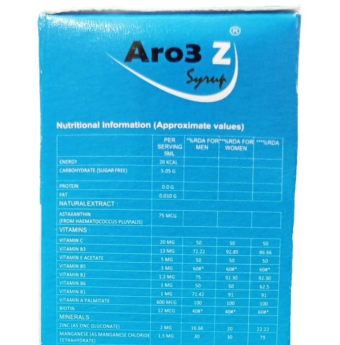 Aro3 Z Syrup Mango Sugar-Free Aro3 Z syrup is a combination of minerals (Copper, Manganese, Selenium, Zinc), Vitamins (Folic acid, Methylcobalamin, Vitamin A, Vitamin B1, Vitamin B2, Vitamin B3, Vitamin B5, Vitamin B6, Vitamin C, Vitamin E) and Pine bark extract. Vitamins and Minerals enhance different immune functions and provide strong nerve support. Aro3 Z syrup combats fatigue, stress, weakness and exhaustion, improves physical performance, and improves the body's resistance to infections.