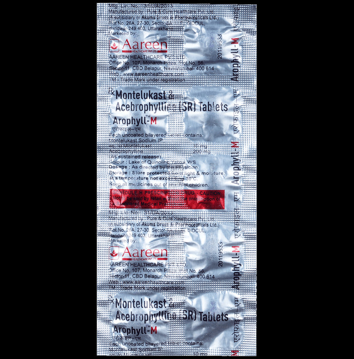 Arophyll-M Tablet SR helps prevent and treat asthma and chronic obstructive pulmonary disorder (COPD). It helps relax the muscles of the air passages thereby making it easier to breathe. It is also use to treat bronchitis.Arophyll-M Tablet SR is taken with or without food in a dose and duration as advised by the doctor. The dose you are given will depend on your condition and how you respond to the medicine. You should keep taking this medicine for as long as your doctor recommends. If you stop treatment too early your symptoms may come back and your condition may worsen. Let your healthcare team know about all other medications you are taking as some may affect, or be affected by this medicine.The most common side effects are vomiting, upset stomach, heartburn, stomach pain, rash, itching, breathing difficulty, nasal inflammation, and flu-like symptoms. Most of these are temporary and usually resolve with time. Contact your doctor straight away if you are at all concerned about any of these side effects. This medicine may also cause dizziness and sleepiness, so do not drive or do anything that requires mental focus until you know how this medicine affects you. Avoid drinking alcohol while taking this medicine as it can worsen your sleepiness.Before taking it, you should tell your doctor if you have any kidney or liver diseases so that your doctor can prescribe a suitable dose for you. You should also tell your doctor if you are pregnant, planning pregnancy, or breastfeeding.