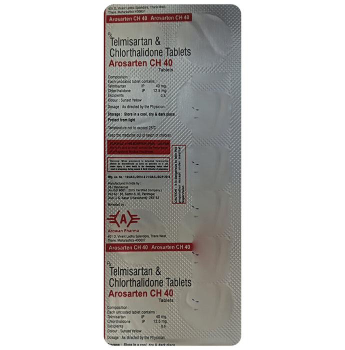 Arosarten CH 40 Tablet contains two medicines, both of which help to control high blood pressure. Lowering blood pressure helps to reduce your risk of having a heart attack or a stroke in the future. You can take Arosarten CH 40 Tablet with or without food. The dose will depend on your condition and how your respond to the medicine. Try to take it at the same time each day. It is important to keep taking this medicine until your doctor tells you not to. It contains a diuretic (water pill) and will make you urinate more so, it is best to avoid taking this medicine within four hours of going to bed. Use this medicine regularly to get the most benefit from it even if you feel well. High blood pressure does not usually have symptoms and if you stop taking it your risk of heart attack or stroke may increase.The most common side effect is dizziness. Other side effects nausea, diarrhea, headache, and altered blood lipids. Frequent urination is not a side effect of this medicine. It is the purpose of chlorthalidone and helps control your blood pressure. You may experience other possible side effects, but most are rare. Make sure you read the leaflet that comes with your medicines and tell your doctor if you are bothered by side effects or they do not go away. It may be possible to adjust your dose or try a different medicine.This medicine is not recommended during pregnancy and you should ask your doctor before taking it if you have kidney or liver disease, heart trouble or diabetes. Drinking alcohol can further lower your blood pressure and may cause side effects.