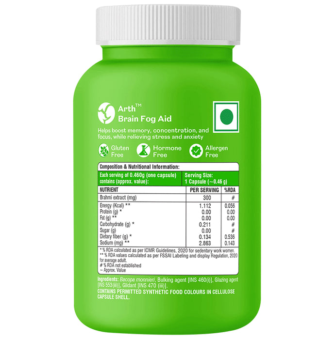 Composition : Brahmi extract (300 mg),Bulking Agent (INS 460(i)),Glazing Agent (INS 553(iii)),Gellant (INS 470(iii))