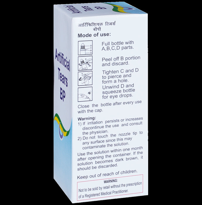 Artificial Tears BP Eye Drop is an eye lubricant or artificial tears used to relieve dry eyes. This can happen because not enough tears are made to keep the eye lubricated. It helps to soothe the irritation and burning seen in dry eyes by maintaining proper lubrication of the eyes. Artificial Tears BP Eye Drop is usually taken when needed. Use the number of drops as advised by your doctor. Wait for at least 5-10 minutes before delivering any other medication in the same eye to avoid dilution. Do not use a bottle if the seal is broken before you open it. Always wash your hands and do not touch the end of the dropper. This could infect your eye. This medicine may require long-term use and can be taken safely for as long as you need it.The most common side effects of using this medicine are blurred or altered vision, redness or irritation and sometimes pain in the eye. Let your doctor know if you experience these symptoms but they are usually temporary. Do not drive, use machinery, or do any activity that requires clear vision until you are sure you can do it safely. Consult your doctor if your condition does not improve or if the side effects bother you.This medicine is not likely to affect or be affected by other medicines you use but tell your doctor if you have ever had glaucoma. Do not use it while wearing soft contact lenses and talk to your doctor if you develop an eye infection while using it.