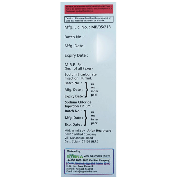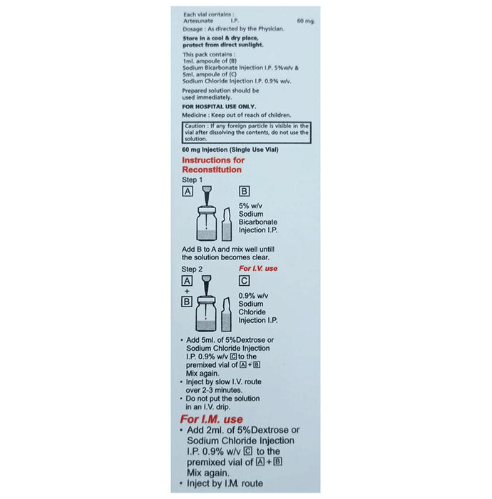 Artisin Injection is an antiparasitic medication. It is used in the treatment of malaria. It is not used to prevent malaria or to treat severe malaria (where it has affected the brain, lungs, or kidneys). Artisin Injection is administered as an injection by a healthcare professional. Kindly do not self-administer. It is given in cases where oral administration is not possible.Some people may experience a headache, dizziness, weakness, and loss of appetite, as the side effects of this medicine. You may also notice some injection site reactions like pain, swelling, or redness. Please consult your doctor if these side effects persist for a longer duration. You may be monitored with blood tests once a week for 4 weeks to detect the presence of malarial parasites.
