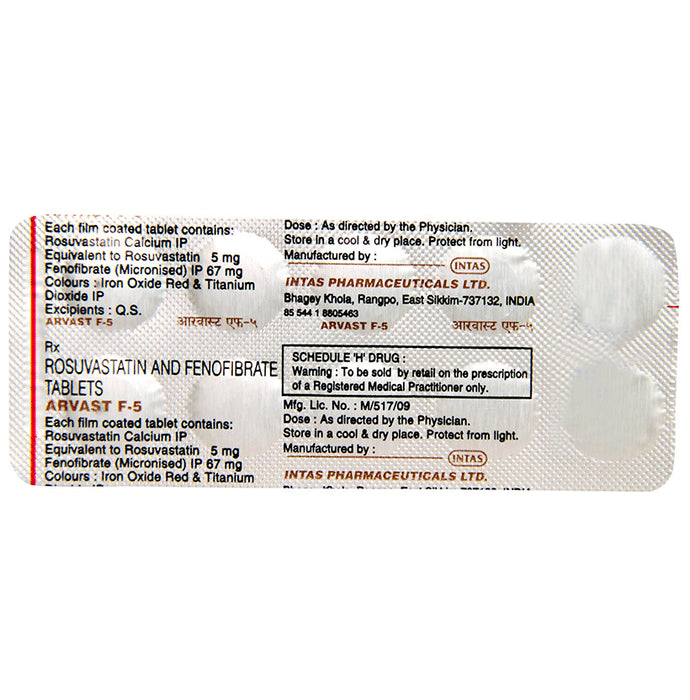 Arvast F 5 Tablet is a combination of two lipids (fat) lowering medicines. It is used to lower the levels of lipids known as cholesterol and triglycerides in the blood when lifestyle changes (eg. low-fat diet) on their own have failed. This medicine helps to reduce the risk of heart disease. Arvast F 5 Tablet can be taken with a meal or on an empty stomach. You can take it at any time of the day but try to take it at the same time each day. This will help you remember to take it. Your doctor will prescribe the right dose depending on your lipid levels and how you respond to this medicine. Most people with high cholesterol and triglyceride do not feel ill, but stopping your medicine may increase your lipid levels, making your condition worse and increasing your risk of heart disease and stroke.It is important to have your cholesterol and triglyceride levels (lipid profile) checked regularly. This medicine is only one part of a treatment program which should also include a healthy low-fat diet, regular exercise, smoking cessation, moderation of alcohol intake, and weight reduction. You can eat normally while taking this medicine, but try to avoid foods that are high in fat.Nausea, stomach pain, constipation, headache, flatulence (excessive gas), and muscle pain are some of the common side effects of this medicine. These are usually mild and disappear after a short time. Consult your doctor if they persist or if you notice any yellowing of your eyes, unusual bleeding or bruising, or get repeated, severe, or unexplained muscle pains. You may be advised to get your liver function tested periodically while taking this medicine.This medicine should not be used in conditions such as liver disease (eg. abnormal blood tests for liver function, persistent yellowness of eyes, etc.). Before taking it, let your doctor know if you have any kidney-related problems or if you are pregnant, planning a pregnancy, or breastfeeding. Diabetic patients should monitor their blood sugar levels while taking this medicine, as it may lead to an increase in blood sugar levels.