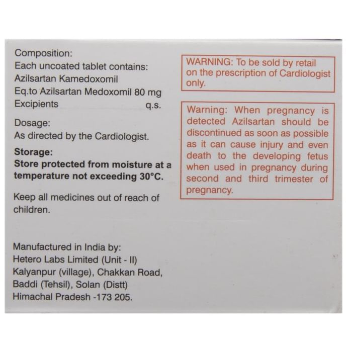 Asar 80 Tablet is a medicine used to treat high blood pressure and heart failure. Lowering blood pressure helps to prevent future heart attack and stroke. This medicine is also effective in preserving kidney function in patients with diabetes. Asar 80 Tablet can be prescribed either alone or in combination with other medicines. It may be taken with or without food during the day or at night. However, try to take it at the same time each day to get the most benefit. It is important to continue taking it regularly even if you feel well or if your blood pressure is controlled. Most people with high blood pressure do not feel ill, but if you stop taking this medicine, your condition could get worse. This is a widely used medicine and is considered safe for long-term use.Making some changes in your lifestyle will also help lower your blood pressure. These may include regular exercise, losing weight, smoking cessation, reducing alcohol intake, and reducing the amount of salt in your diet as advised by your doctor. This medicine is tolerated well by most patients and has few side effects. Dizziness, particularly after the first dose, is known to occur in some people. This may be associated with headache. Let your doctor know if these side effects bother you or do not go away. No weight gain has been seen with the regular use of this medicine.Before taking this medicine, let your doctor know if you have any kidney or liver problems. Pregnant or breastfeeding mothers should also consult their doctor before taking it. Your doctor may check your kidney function, blood pressure, and potassium levels in your blood at regular intervals while you are taking this medicine.