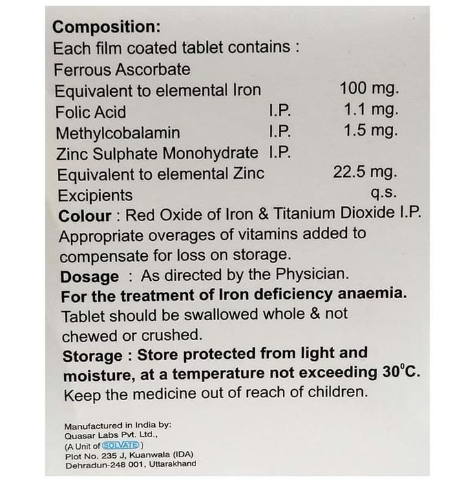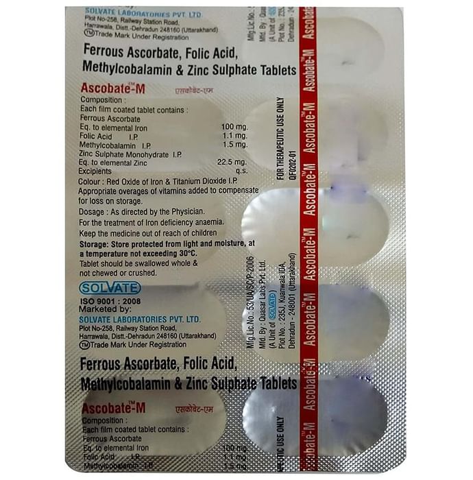 Ascobate M tablet contains Ferrous ascorbate , Folic acid, Zinc and MethylcobalaminFerrous ascorbate (Iron) transports oxygen throughout the body and maintains red blood cells, thus making an individual feel energetic and preventing anemia.Folic acid is essential to numerous bodily functions ranging from nucleotide biosynthesis to the remethylation of homocysteine. It is especially important during periods of rapid cell division and growth. Both children and adults require folic acid to produce healthy red blood cells and prevent anemia. Zinc sulphate and Methylcobalamin are of particular importance during pregnancy. Whereas, Zinc is essential for normal foetal growth. Methylcobalamin promotes the initiation and maturation of blood cells supporting the pregnancy.Ascobate M tablet is used for the treatment ofIron deficiency anemia,Iron deficiency due to chronic blood loss or low intake of ironIron deficiency anaemia and nutritional anaemia that occurs especially during pregnancy and lactation. Ascobate M tablet can be taken orally with water, after meals. Use under medical supervision.