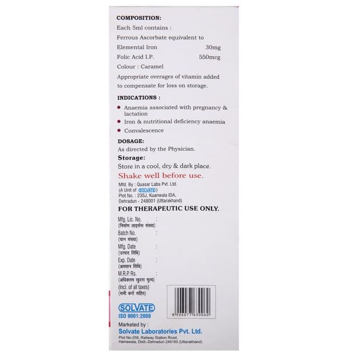 Ascorbate-XT syrup contains Ferrous Ascorbate (Iron) and Folic Acid (vitamin B9). Folic acid is essential to numerous bodily functions ranging from nucleotide biosynthesis to the remethylation of homocysteine. It is especially important during periods of rapid cell division and growth. Both children and adults require folic acid to produce healthy red blood cells and prevent anemia. Iron transports oxygen throughout the body and maintains red blood cells, thus making an individual feel energetic and preventing anemia.  Ascorbate-XT syrup is used for the treatment of Iron deficiency anemia,Iron deficiency due to chronic blood loss or low intake of ironIron deficiency anaemia and nutritional anaemia that occurs especially during pregnancy and lactation.    Use under medical supervision.