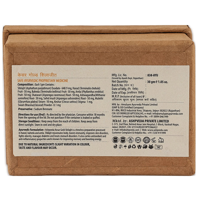 Ashpveda Kesar gold Shilajeet is a potent blend of adaptogenic herbs, crafted to support hormone balance, immunity and memory care. An effective ayurvedic formulation which is ideal for improving strength, stamina and power and beneficial in relieving general weakness.