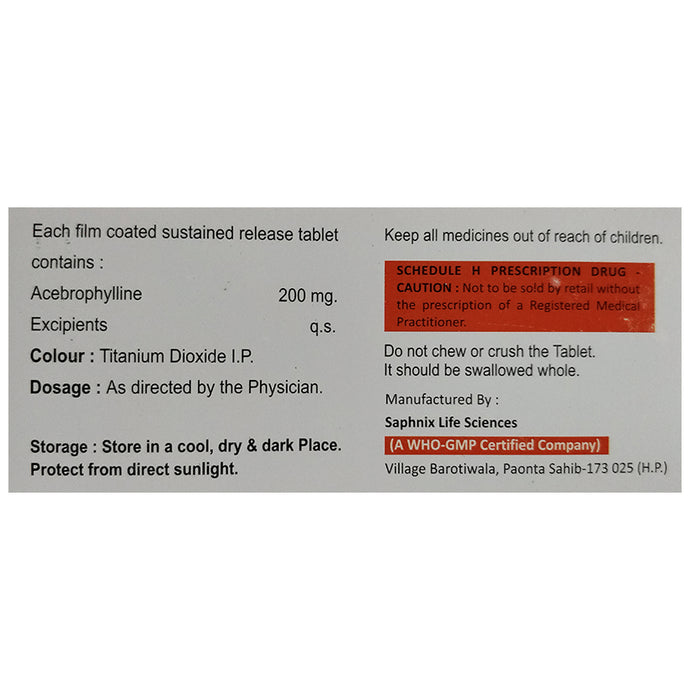 Asmapil 200 Tablet SR is used to treat and prevent symptoms of asthma, bronchitis, and chronic obstructive pulmonary disorder (a lung disorder in which flow of air to the lung is blocked). It helps in relaxing the muscles of the air passages, thus widening it and making it easier to breathe. Asmapil 200 Tablet SR can be taken with the food in evening. Take it at the same time every day to get the most benefit. The dose and how often you take it depends on what you are taking it for. Your doctor will decide how much you need to improve your symptoms. Take this medicine for as long as it is prescribed for you. Do not miss even a single dose, if in any case, you missed a dose, take it as soon as you remember or better to skip the missed dose and continue with regular dosing. It does not work immediately or prevent the already started breathing trouble, hence always carry your medical inhaler with you for an emergency.The most common side effects of this medicine include abdominal discomfort, abdominal distension, vomiting, abdominal pain, diarrhea, constipation, and heart burn. If these bother you or appear serious, let your doctor know. There may be ways of reducing or preventing them. Generally, it is advised not to consume alcohol or do not smoke while on treatment.Before taking this medicine, let your doctor if you have kidney or liver disease or if you have heart-related problems. Your doctor should also know about all other medicines you are taking as many of these may make this medicine less effective or change the way it works. Inform your doctor if you are pregnant or breastfeeding before starting the treatment.