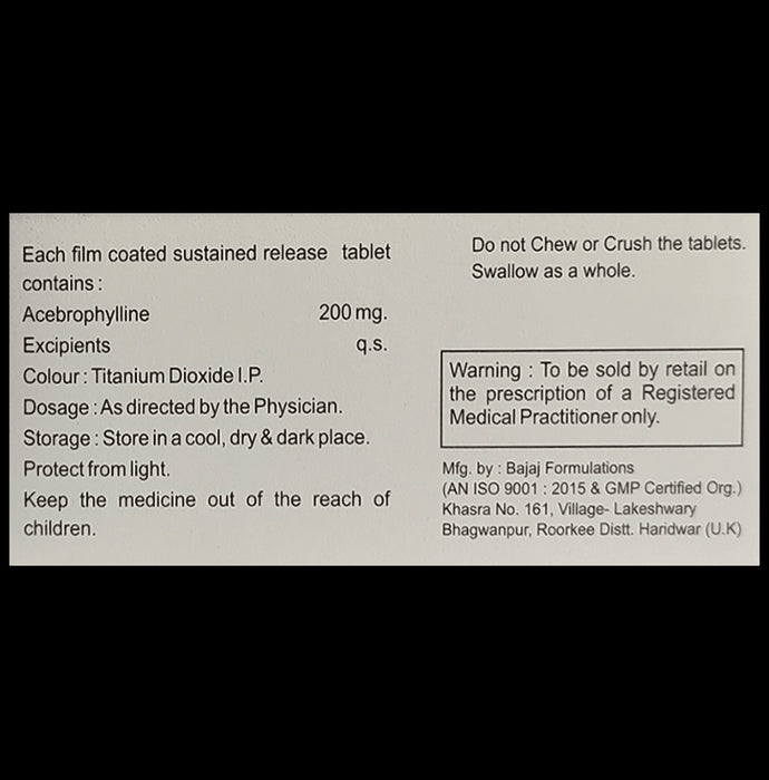 Asthagrip 200 SR Tablet is used to treat and prevent symptoms of asthma, bronchitis, and chronic obstructive pulmonary disorder (a lung disorder in which flow of air to the lung is blocked). It helps in relaxing the muscles of the air passages, thus widening it and making it easier to breathe. Asthagrip 200 SR Tablet can be taken with the food in evening. Take it at the same time every day to get the most benefit. The dose and how often you take it depends on what you are taking it for. Your doctor will decide how much you need to improve your symptoms. Take this medicine for as long as it is prescribed for you. Do not miss even a single dose, if in any case, you missed a dose, take it as soon as you remember or better to skip the missed dose and continue with regular dosing. It does not work immediately or prevent the already started breathing trouble, hence always carry your medical inhaler with you for an emergency.The most common side effects of this medicine include abdominal discomfort, abdominal distension, vomiting, abdominal pain, diarrhea, constipation, and heart burn. If these bother you or appear serious, let your doctor know. There may be ways of reducing or preventing them. Generally, it is advised not to consume alcohol or do not smoke while on treatment.Before taking this medicine, let your doctor if you have kidney or liver disease or if you have heart-related problems. Your doctor should also know about all other medicines you are taking as many of these may make this medicine less effective or change the way it works. Inform your doctor if you are pregnant or breastfeeding before starting the treatment.