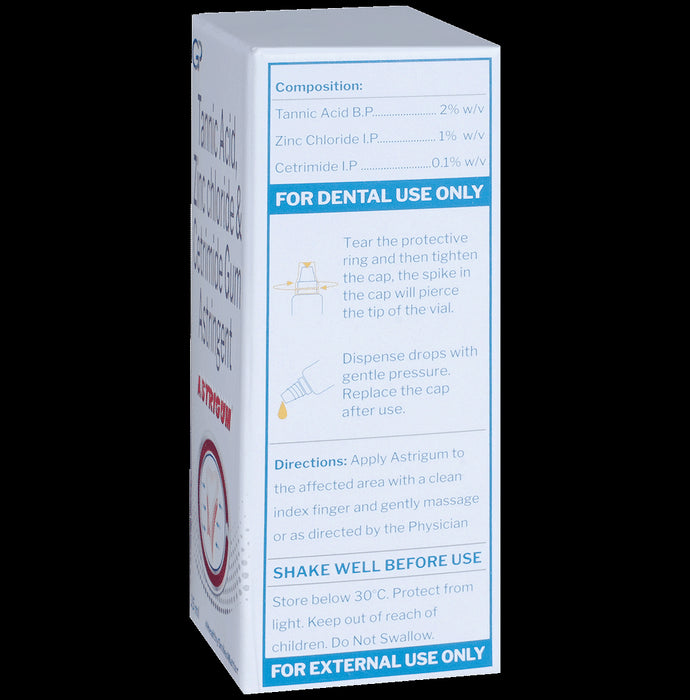 Astrigum Gum Paint is a topical solution that contains antiseptic agents combined with tanning agents. It is applied locally on gums to address severe bacterial infections, inflammatory conditions, painful gum problems, inflamed and bleeding gums, teething pain and irritation, stomatitis, and other gum-related issues.