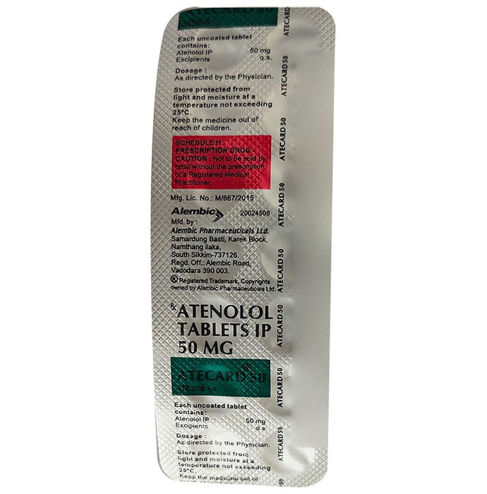 Atecard 50 Tablet belongs to a group of medicines called beta-blockers. It is used to treat high blood pressure (hypertension), angina (heart-related chest pain), irregular heart rhythms (arrhythmia). It also helps to prevent future heart attacks and stroke. Atecard 50 Tablet may be prescribed alone or together with other medications. The dose and frequency depend on what you are taking it for and the severity of your condition. It may be taken empty stomach or with a meal, but take it regularly at the same time each day to get the most benefit. It may take several weeks before you get the full benefit of this medicine and you may need to take it for the rest of your life. However, it is important to continue taking it even if you feel well. Most people with high blood pressure do not feel ill and if you stop taking it, your condition may worsen.The main side effects of this medicine are fatigue, slow heart rate, feeling dizzy, diarrhea, and nausea. These are usually mild and short-lived. It may also cause shortness of breath or low blood pressure in some people. To reduce the risk of side effects your doctor will probably start the medicine at a low dose and gradually increase it. Consult your doctor if the side effects bother you or do not go away.Before taking it, let your doctor know if you have any liver problems. It may also not be suitable for people who have a slow heart rate, severe circulation problems, severe heart failure, or low blood pressure. Pregnant or breastfeeding mothers should also consult their doctor before taking it. You must talk to your doctor to find out whether this medicine is suitable for you to use. You should have your blood pressure checked regularly to make sure that this medicine is working properly. Avoid drinking alcohol as it may increase certain side effects.