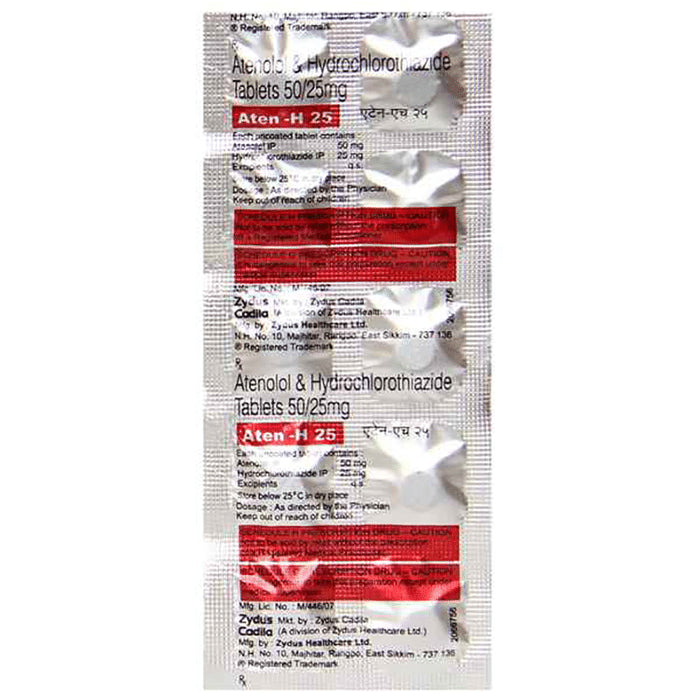 Aten-H 25 Tablet is a combination of two medicines used to treat hypertension (high blood pressure). It helps to control blood pressure when a single medication is not effective. It also helps to reduce chances of any future heart attack and stroke. Aten-H 25 Tablet is taken on an empty stomach preferably in the morning to avoid frequent urination at night. Keep taking it for as long as advised by your doctor. Even if you feel well, do not stop this medicine on your own because high blood pressure often has no symptoms. If you stop taking it, your condition may get worse. Keeping active with regular exercise, reducing your weight and eating a healthy diet will also help control your blood pressure. Follow your doctor’s advice while taking this medicine.Nausea, diarrhea, headache, and fatigue are some common side effects of this medicine. Consult your doctor If any of these bother you, or get worse, or do not go away. Drink plenty of fluids while taking medicine to overcome muscle weakness, dry mouth, and extreme thirst. Dizziness or headache may occur due to low blood pressure but this gets better with time.Before taking it, let your doctor know if you have any liver or kidney problems. Pregnant or breastfeeding women should also consult their doctor for advice before taking this medicine. You also need to tell your doctor what other medicines you are taking especially those used to treat high blood pressure or heart conditions. You should have your blood pressure, kidney function, blood sugar level and the levels of salts such as potassium or magnesium checked regularly to make sure that this medicine is working properly.