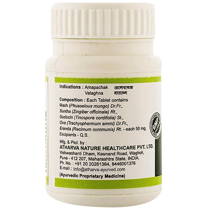 Atharva Mashyog Vati contains mash, sunth, ova and eandmool. It effectively works on amapachak and vataghna.