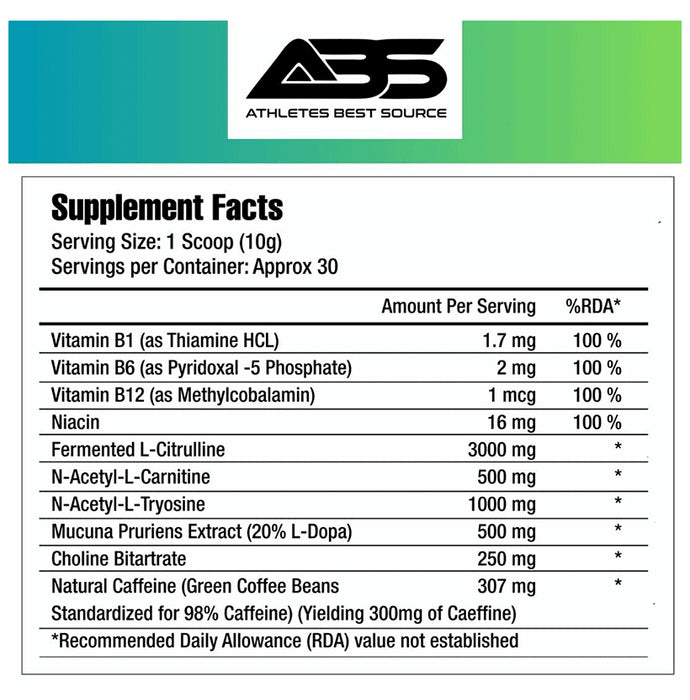 Composition : Vitamin B1 (as Thiamine HCL), Vitamin B6 (as Pyridoxal -5 Phosphate), Vitamin B12 (as Methylcobalamin), Niacin, Fermented L-Citrulline, N-Acetyl-L-Carnitine, N-Acetyl-L-Tryosine, Mucuna Pruriens Extract (20% L-Dopa), Choline Bitartrate, Natural Caffeine (Green Coffee Beans)