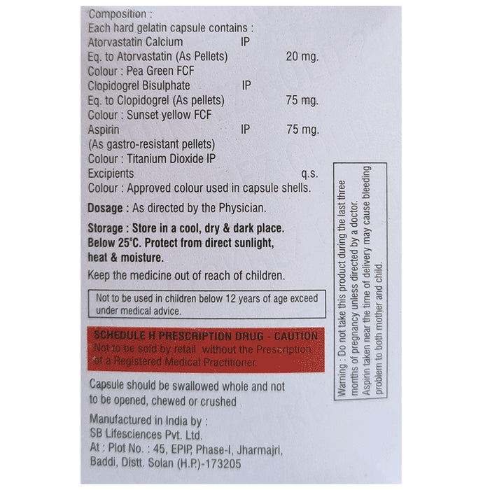 Composition : Aspirin (75mg) + Atorvastatin (20mg) + Clopidogrel (75mg)
