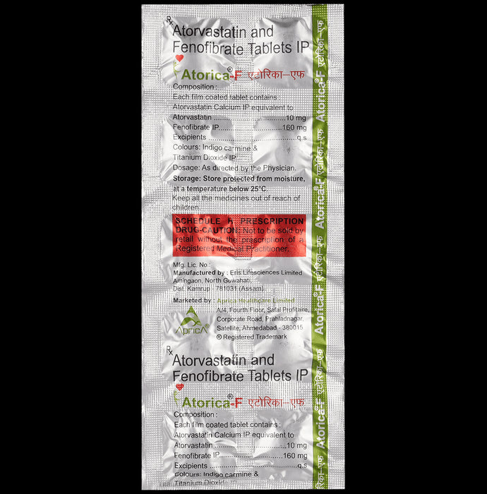 Atorica F Tablet is a combination of two lipids (fat) lowering medicines. It is used to lower the levels of lipids known as cholesterol and triglycerides in the blood when lifestyle changes (eg. low-fat diet) on their own have failed. This medicine helps to reduce the risk of heart disease. Atorica F Tablet can be taken with a meal or on an empty stomach. You can take it at any time of the day but try to take it at the same time each day. This will help you remember to take it. Your doctor will prescribe the right dose depending on your lipid levels and how you respond to this medicine. Most people with high cholesterol and triglyceride do not feel ill, but stopping your medicine may increase your lipid levels, making your condition worse and increasing your risk of heart disease and stroke.It is important to have your cholesterol and triglyceride levels (lipid profile) checked regularly. This medicine is only one part of a treatment program which should also include a healthy low-fat diet, regular exercise, smoking cessation, moderation of alcohol intake, and weight reduction. You can eat normally while taking this medicine, but try to avoid foods that are high in fat.Nausea, stomach pain, diarrhea, constipation, headache, insomnia, flatulence (excessive gas), and muscle pain are some of the common side effects of this medicine. These are usually mild and disappear after a short time. Consult your doctor if they persist or if you notice any yellowing of your eyes, unusual bleeding or bruising, or get repeated, severe, or unexplained muscle pains. You may be advised to get your liver function tested periodically while taking this medicine.This medicine should not be used in conditions such as liver disease (eg. abnormal blood tests for liver function, persistent yellowness of eyes, etc.). Before taking it, let your doctor know if you have any kidney-related problems or if you are pregnant, planning a pregnancy, or breastfeeding. Diabetic patients should monitor their blood sugar levels while taking this medicine, as it may lead to an increase in blood sugar levels.