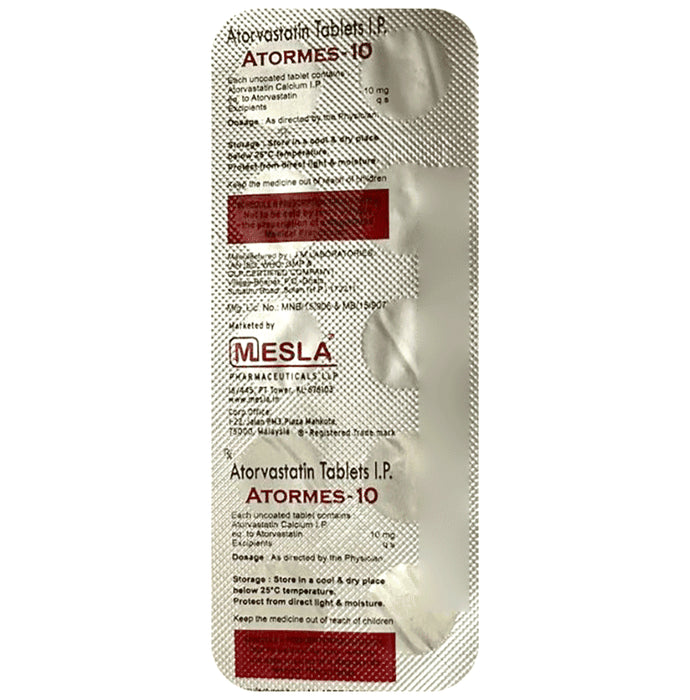 Atormes 10 Tablet belongs to a group of medicines called statins. It is used to lower cholesterol and to reduce the risk of heart diseases. Cholesterol is a fatty substance that builds up in your blood vessels and causes narrowing, which may lead to a heart attack or stroke.Atormes 10 Tablet is a widely prescribed medicine and is regarded as safe for long-term use when taken as per the doctor's advice. It can be taken with a meal or on an empty stomach. You can take it at any time of the day but try to take it at about the same time each day. Most people with high cholesterol do not feel ill, but stopping your medicine may increase your cholesterol levels thereby increasing your risk of heart disease and stroke.It is important to have your cholesterol levels checked regularly. This medicine is only one part of the treatment program which should also include a healthy diet, regular exercise, smoking cessation, moderation of alcohol intake, and weight reduction. You can eat normally while taking this medicine, but try to avoid foods that are high in fat. Common side effects of this medicine include constipation, flatulence, dyspepsia, and abdominal pain. These are usually mild and disappear after a short time. Consult your doctor if they persist or if you notice any yellowing of your eyes or get repeated or unexplained muscle pains. This medicine should not be used in some conditions such as liver disease. Also, pregnant women and breastfeeding mothers should not take this medicine as it may harm the developing baby. Diabetic patients should monitor their blood sugar levels while taking this medicine, as it may lead to an increase in blood sugar levels. Your doctor may check your liver function before starting the treatment and monitor it regularly thereafter.