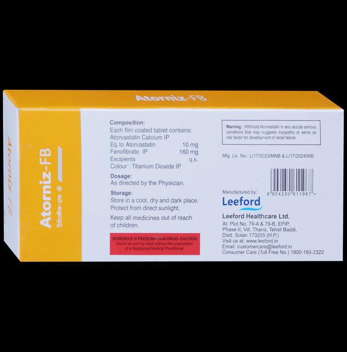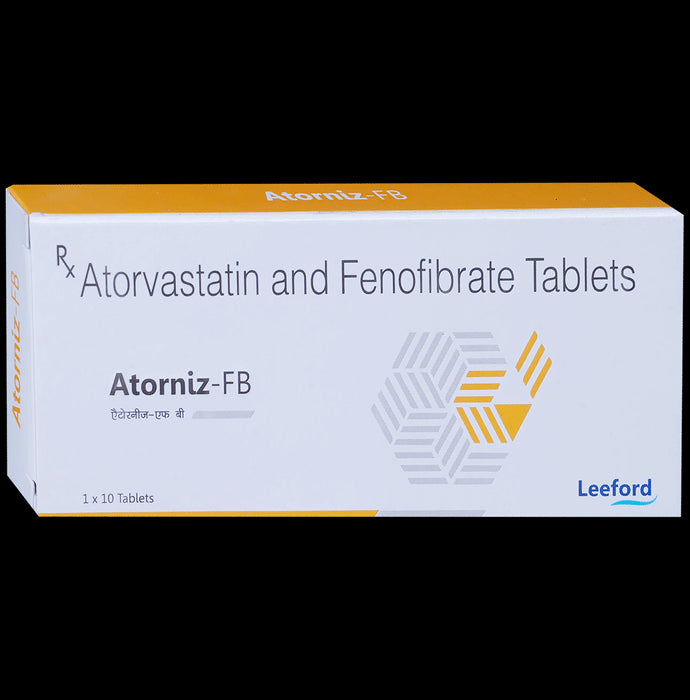 Atorniz-FB Tablet is a combination of two lipids (fat) lowering medicines. It is used to lower the levels of lipids known as cholesterol and triglycerides in the blood when lifestyle changes (eg. low-fat diet) on their own have failed. This medicine helps to reduce the risk of heart disease. Atorniz-FB Tablet can be taken with a meal or on an empty stomach. You can take it at any time of the day but try to take it at the same time each day. This will help you remember to take it. Your doctor will prescribe the right dose depending on your lipid levels and how you respond to this medicine. Most people with high cholesterol and triglyceride do not feel ill, but stopping your medicine may increase your lipid levels, making your condition worse and increasing your risk of heart disease and stroke.It is important to have your cholesterol and triglyceride levels (lipid profile) checked regularly. This medicine is only one part of a treatment program which should also include a healthy low-fat diet, regular exercise, smoking cessation, moderation of alcohol intake, and weight reduction. You can eat normally while taking this medicine, but try to avoid foods that are high in fat.Nausea, stomach pain, diarrhea, constipation, headache, insomnia, flatulence (excessive gas), and muscle pain are some of the common side effects of this medicine. These are usually mild and disappear after a short time. Consult your doctor if they persist or if you notice any yellowing of your eyes, unusual bleeding or bruising, or get repeated, severe, or unexplained muscle pains. You may be advised to get your liver function tested periodically while taking this medicine.This medicine should not be used in conditions such as liver disease (eg. abnormal blood tests for liver function, persistent yellowness of eyes, etc.). Before taking it, let your doctor know if you have any kidney-related problems or if you are pregnant, planning a pregnancy, or breastfeeding. Diabetic patients should monitor their blood sugar levels while taking this medicine, as it may lead to an increase in blood sugar levels.