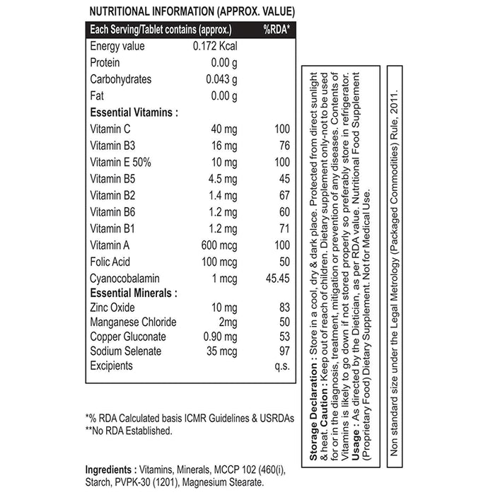 Atoroz Tablet Multivitamin Veg Tablets With Zinc, Vitamin C, Protein, Vitamin A And Iron Support Health Protection, Bones & Overall Health For Women & Men is a combination of minerals (copper, manganese, selenium, zinc), vitamins (folic acid, methylcobalamin, vitamin A, vitamin B1, vitamin B2, vitamin B3, vitamin B5, vitamin B6, vitamin C, vitamin E) and antioxidants. It is used to manage or prevent vitamin deficiency due to poor diet and certain illnesses.