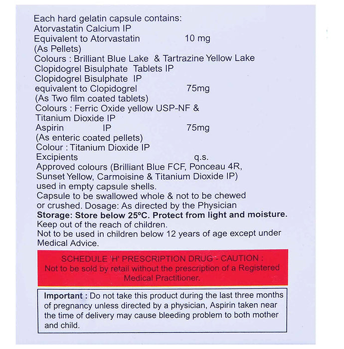 Composition : Aspirin (75mg) + Atorvastatin (10mg) + Clopidogrel (75mg)