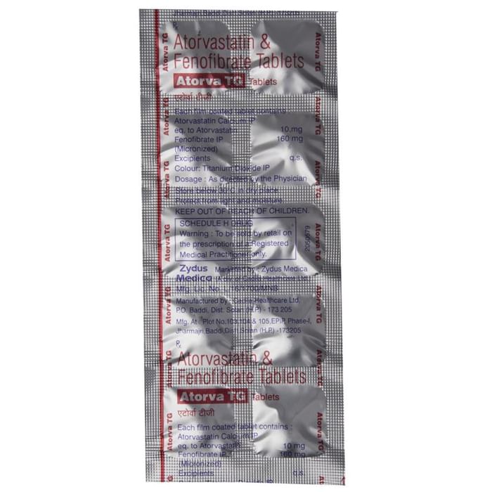 Atorva TG Tablet is a combination of two lipids (fat) lowering medicines. It is used to lower the levels of lipids known as cholesterol and triglycerides in the blood when lifestyle changes (eg. low-fat diet) on their own have failed. This medicine helps to reduce the risk of heart disease. Atorva TG Tablet can be taken with a meal or on an empty stomach. You can take it at any time of the day but try to take it at the same time each day. This will help you remember to take it. Your doctor will prescribe the right dose depending on your lipid levels and how you respond to this medicine. Most people with high cholesterol and triglyceride do not feel ill, but stopping your medicine may increase your lipid levels, making your condition worse and increasing your risk of heart disease and stroke.It is important to have your cholesterol and triglyceride levels (lipid profile) checked regularly. This medicine is only one part of a treatment program which should also include a healthy low-fat diet, regular exercise, smoking cessation, moderation of alcohol intake, and weight reduction. You can eat normally while taking this medicine, but try to avoid foods that are high in fat.Nausea, stomach pain, diarrhea, constipation, headache, insomnia, flatulence (excessive gas), and muscle pain are some of the common side effects of this medicine. These are usually mild and disappear after a short time. Consult your doctor if they persist or if you notice any yellowing of your eyes, unusual bleeding or bruising, or get repeated, severe, or unexplained muscle pains. You may be advised to get your liver function tested periodically while taking this medicine.This medicine should not be used in conditions such as liver disease (eg. abnormal blood tests for liver function, persistent yellowness of eyes, etc.). Before taking it, let your doctor know if you have any kidney-related problems or if you are pregnant, planning a pregnancy, or breastfeeding. Diabetic patients should monitor their blood sugar levels while taking this medicine, as it may lead to an increase in blood sugar levels.