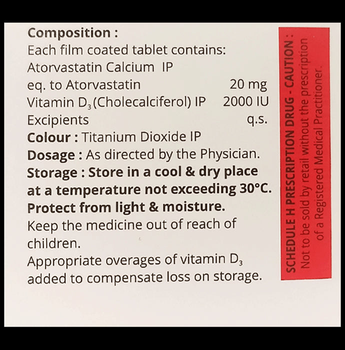 Composition : Atorvastatin (20mg) + Vitamin D3 (2000IU)