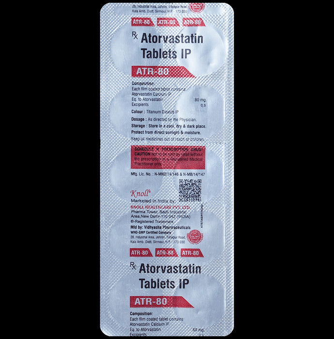 ATR 80 Tablet belongs to a group of medicines called statins. It is used to lower cholesterol and to reduce the risk of heart diseases. Cholesterol is a fatty substance that builds up in your blood vessels and causes narrowing, which may lead to a heart attack or stroke. ATR 80 Tablet is a widely prescribed medicine and is regarded as safe for long-term use when taken as per the doctor's advice. It can be taken with a meal or on an empty stomach. You can take it at any time of the day but try to take it at about the same time each day. Most people with high cholesterol do not feel ill, but stopping your medicine may increase your cholesterol levels thereby increasing your risk of heart disease and stroke.It is important to have your cholesterol levels checked regularly. This medicine is only one part of the treatment program which should also include a healthy diet, regular exercise, smoking cessation, moderation of alcohol intake, and weight reduction. You can eat normally while taking this medicine, but try to avoid foods that are high in fat. Common side effects of this medicine include constipation, flatulence, dyspepsia, and abdominal pain. These are usually mild and disappear after a short time. Consult your doctor if they persist or if you notice any yellowing of your eyes or get repeated or unexplained muscle pains. This medicine should not be used in some conditions such as liver disease. Also, pregnant women and breastfeeding mothers should not take this medicine as it may harm the developing baby. Diabetic patients should monitor their blood sugar levels while taking this medicine, as it may lead to an increase in blood sugar levels. Your doctor may check your liver function before starting the treatment and monitor it regularly thereafter.