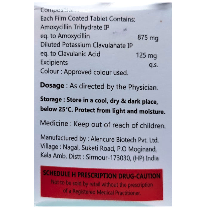 Composition : Amoxycillin (875mg) + Clavulanic Acid (125mg)