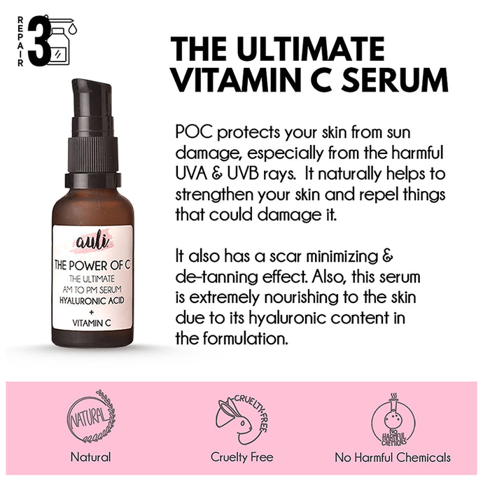 Auli The Power of C the Ultimate Vitamin C is an effective shield for your skin against UVA and UVB radiation, which can cause skin damage. It also works to reduce scarring and de-tan. It contains vitamin C, which possesses antioxidant characteristics that aid in preventing and repairing free radical oxidative damage and vitamin E, which strengthens and protects the skin's outer layer while also repairing skin damage. This product effectively brightens and hydrates your skin, resulting in healthy, even-toned and radiant skin.