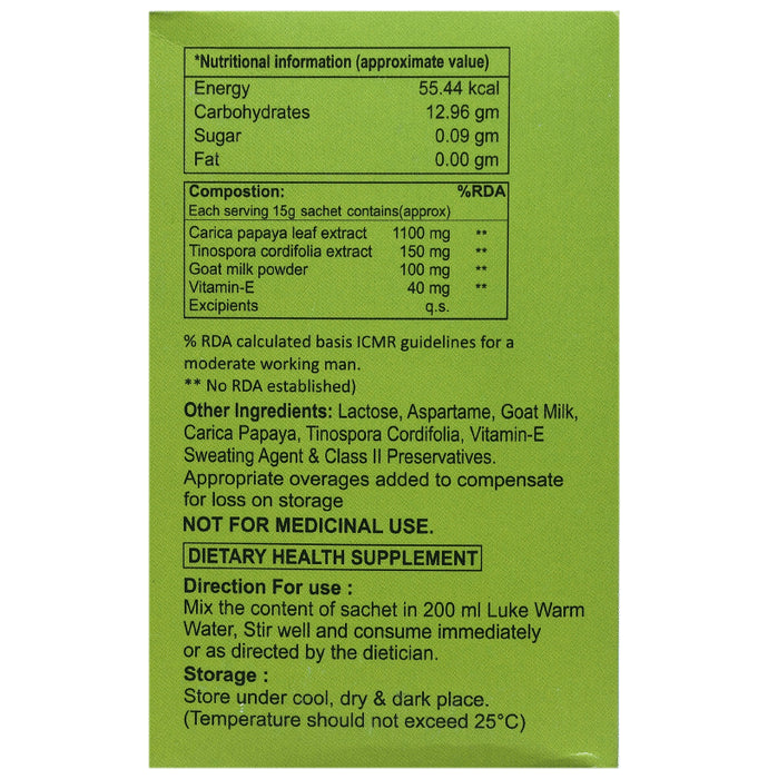 Composition : Carica papaya leaf extract 1100 mg,Tinospora cordifolia extract 150 mg,Goat milk powder 100 mg,Vitamin-E 40 mg