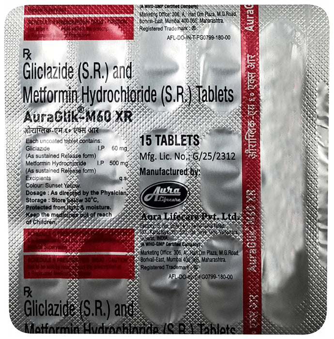 Auraglik-M60 XR Tablet SR belongs to a category of medicines known as anti-diabetic drugs. It is a combination of two medicines used to treat type 2 diabetes mellitus in adults. It helps control blood sugar levels in people with diabetes. Auraglik-M60 XR Tablet SR should be taken with food. Take it regularly at the same time each day to get the most benefit. Your doctor will decide what dose is best for you and this may change from time to time according to how it is working according to your blood sugar levels.Keep taking this medicine, even if you feel well or your blood sugar levels are controlled. If you stop it without consulting your doctor, your blood sugar levels could rise and put you at risk of kidney damage, blindness, nerve problems and loss of limbs. Remember that it is only part of a treatment program that should also include a healthy diet, regular exercise, and weight reduction as advised by your doctor. Your lifestyle plays a big part in controlling diabetes.The most common side effect of Auraglik-M60 XR Tablet SR are low blood glucose levels (hypoglycemia), constipation, and vomiting. Make sure you recognize the signs of having low blood glucose levels, such as sweating, dizziness, headache, and shaking and know how to deal with it. To prevent this, it's important to have regular meals and always carry a fast-acting source of glucose such as sugary food or fruit juice with you. Drinking alcohol can also increase your risk of low blood sugar levels and should be avoided. Other side effects that may be seen on taking this medicine include taste changes, nausea, diarrhea, stomach pain, headache, and upper respiratory tract infection. Some people may find that they put on weight with this medicine.You should not take it if you have type 1 diabetes mellitus, if you have diabetic ketoacidosis (high levels of acid in your blood), or if you have severe kidney or liver disease. Before taking this medicine, tell your doctor if you have ever had heart disease. It may not be suitable. Pregnant or breastfeeding women should also consult their doctor before taking it. Your blood sugar levels should be checked regularly and your doctor may also advise blood tests to monitor your blood cell counts and liver function.