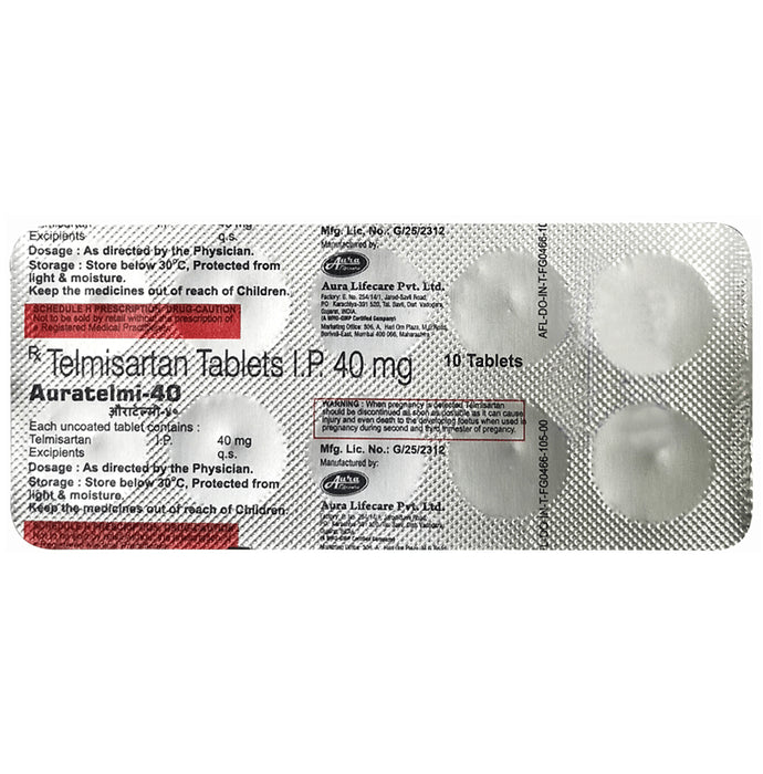 Auratelmi 40 Tablet is a medicine used to treat high blood pressure and heart failure. Lowering blood pressure helps to prevent future heart attacks and strokes. This medicine is also effective in preserving kidney function in patients with diabetes. Auratelmi 40 Tablet can be prescribed either alone or in combination with other medicines. It may be taken with or without food during the day or at night. However, try to take it at the same time each day to get the most benefit. It is important to continue taking it regularly even if you feel well or if your blood pressure is controlled. Most people with high blood pressure do not feel ill, but if you stop taking this medicine, your condition could get worse. This is a widely used medicine and is considered safe for long-term use.Making some changes in your lifestyle will also help lower your blood pressure. These may include regular exercise, losing weight, smoking cessation, reducing alcohol intake, and reducing the amount of salt in your diet as advised by your doctor.This medicine is tolerated well by most patients and has few side effects. However, it may cause hypotension (low blood pressure) in some people. Let your doctor know if you experience any of these side effects. They may be able to help by reducing the dosage or by prescribing you an alternate medicine.Before taking this medicine, let your doctor know if you have any kidney or liver problems. Pregnant or breastfeeding mothers should also consult their doctor before taking it. Your doctor may check your kidney function, blood pressure, and potassium levels in your blood at regular intervals while you are taking this medicine.