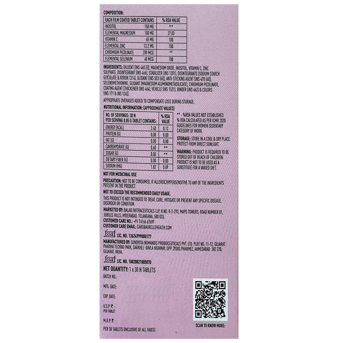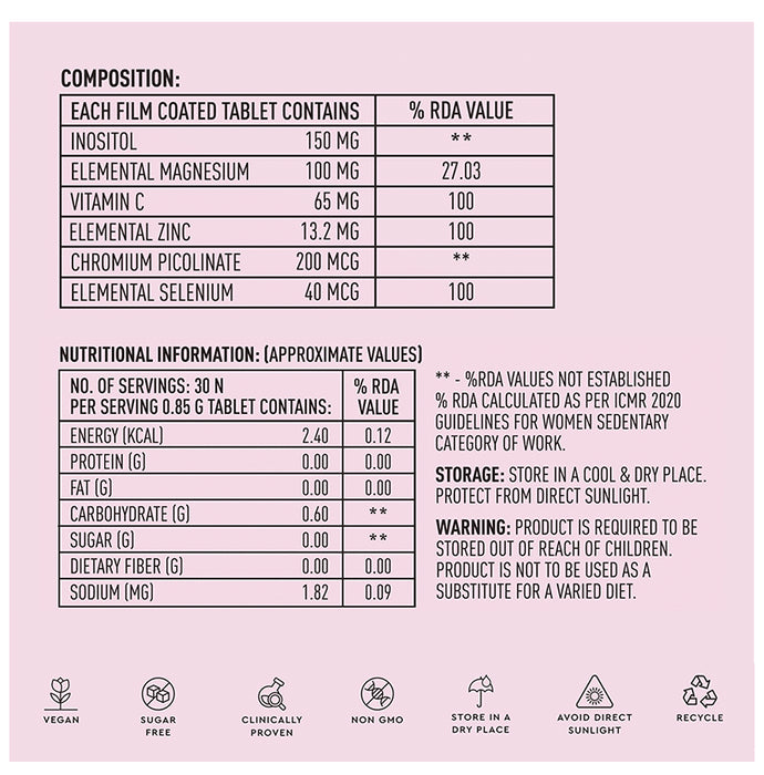Composition : Each film-coated tablet contains: Inositol (150 mg), Elemental Magnesium (100 mg), Vitamin C (65 mg), Elemental Zinc (13.2 mg), Chromium Picolinate (200 mcg), Elemental Selenium (40 mcg), Diluents (INS 460 DL), Magnesium Oxide, Disintegrant (INS 466), Stabiliser (INS 1201), Sodium Starch Glycolate, Kyron T-3141, Glidant (INS 553), Anti-Sticking Agent (INS 470), Selenomethionine, Magnesium Aluminometasilicate, Coating Agent (INS 464), Vehicle (INS 1521), Binder (INS 462), Colors (INS 171, INS 124), Vanilla flavour.