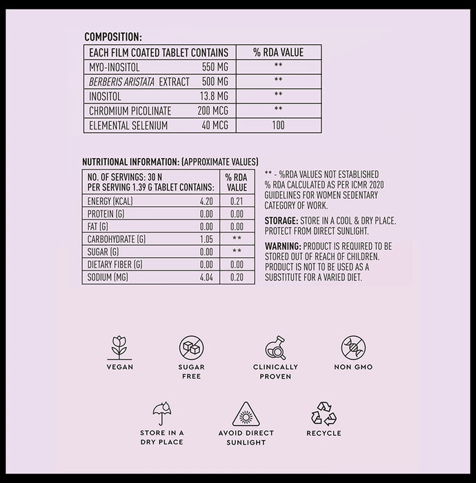 Composition : Each tablet contains: Myo-Inositol 550 mg, Berberis Aristata Extract 500 mg, Inositol 13.8 mg, Chromium Picolinate 200 mcg, Elemental Selenium 40 mcg,Other Ingredients: Diluent (INS 460), disintegrants (INS 466, Kyron T-314 and sodium starch glycolate), stabilizer (INS 1201), glidant (INS 553), anti-sticking agent (INS 470), glidant (magnesium aluminosilicate), coating agent [thickener (INS 464), humectant (INS 1518), vehicle (INS 1521), binder (INS 462) and colours (INS 171 and INS 172)].