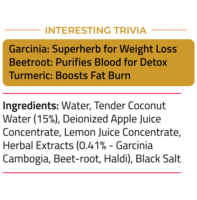 Composition : Tender coconut water,Water,Deionized apple juice concentrate,Lemon juice concentrate,Herbal extracts (Garcinia Cambogia, Beetroot, Haldi),Black salt,Black carrot extract