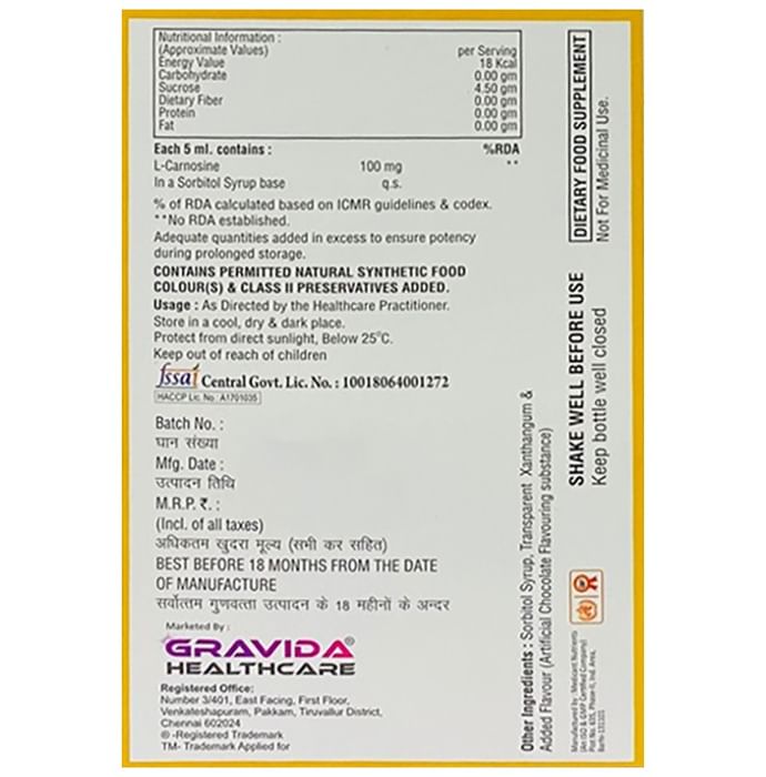 Auti Bliss L Carnosine Syrup is a dietary supplement that may help enhance brain health and prevents neurodegeneration. It contains L Carnosine 100mg in every 5ml and is beneficial in preventing autism, ADHD and other neurodegenerative disorders.