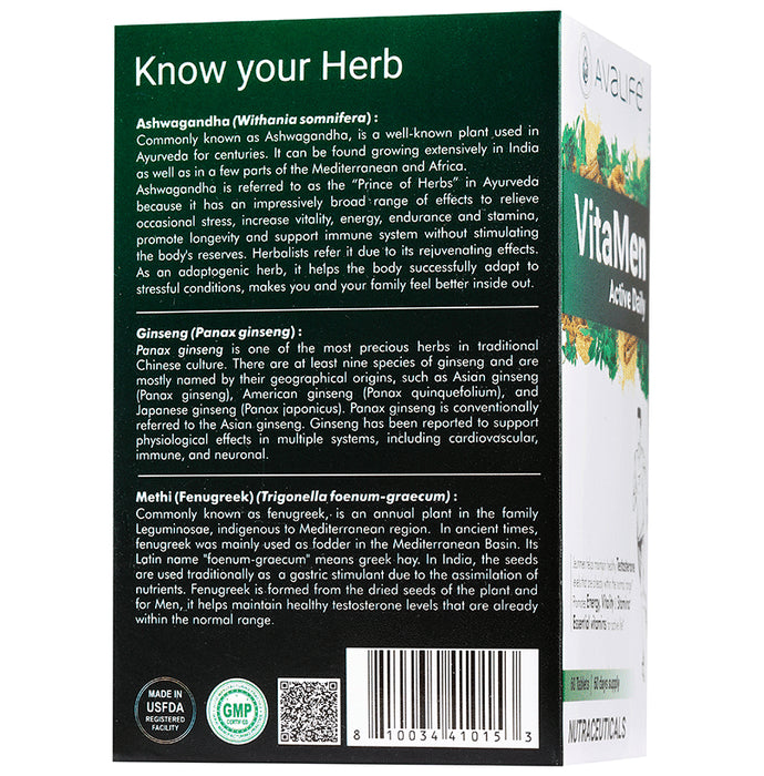 Avalife Vitamen Active Daily TabletIt is a dietary supplement formulated with multivitamins, multi-minerals and essential herbs that promote overall health and well-being. It has potent antioxidants that protect the body against free radicals and boost immunity. It helps to fill the nutritional gaps, enhance energy levels and promote growth and development.