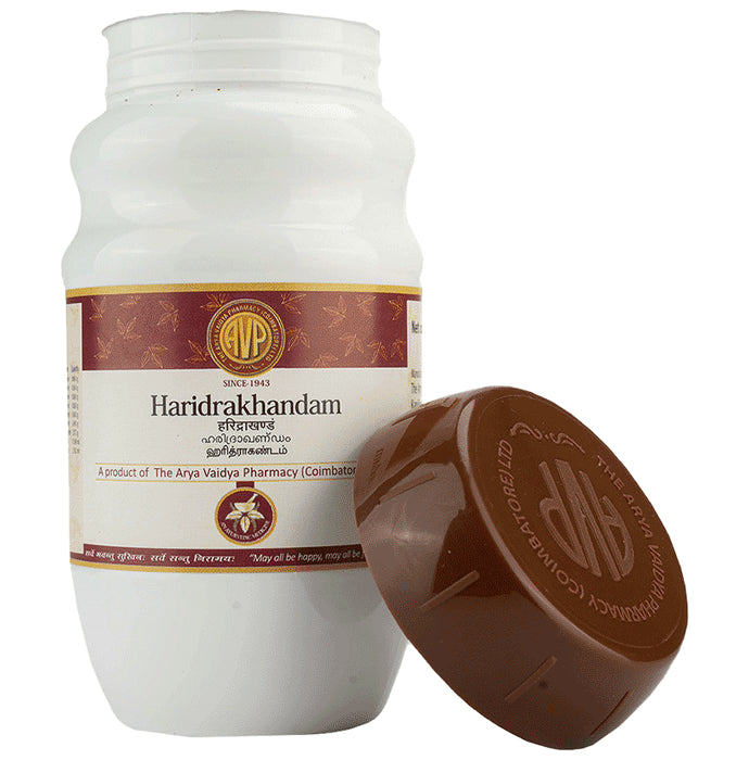 AVP Haridrakhandam Granules is an anti-allergy formulation that is made with natural and safe herbs that restore the body’s immunity and helps fight allergens to bring the body back to normalcy. The main ingredient is turmeric, which is fried in desi cow ghee and mixed with other herbs. Turmeric has anti-inflammatory and anti-allergy properties that help the body counter different allergic reactions.