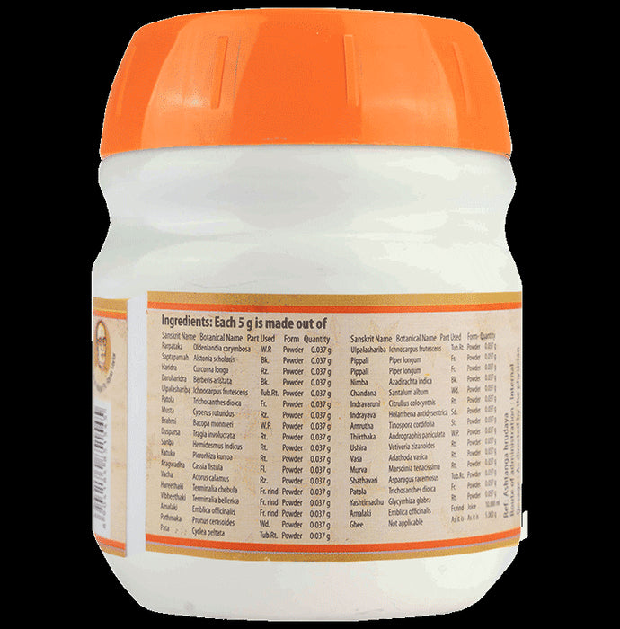 AVP Mahathikthaka gritham is a balancing combination of Pitta-dominant drugs in a nourishing ghee base. Ayurvedic materia medica lists groups of drugs based on their "rasa" or flavour. Drugs with a dominant "Tikta rasa" or bitter taste act upon disrupted Pitta and "digest" it. It may be understood as the resolution of inflammatory changes in the gut, skin, bones and joints. The proteins and antioxidants work together to soothe and control flare-ups. Saptapama and Vetiver help to tighten pores and even skin tone, balancing oil content and pH. The formulation does not have any side effects and is safe for usage.