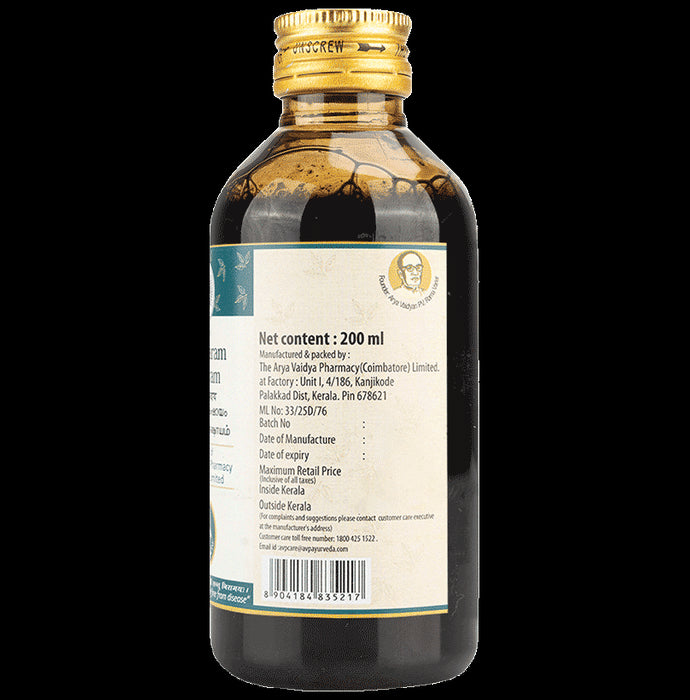 AVP Sapthasaram kashayam is an ayurvedic medicine used to relieve ascites, constipation, dyspareunia, and other related conditions. It is made using seven ayurvedic herbs, which is one of the prescriptions for dealing with stomach ache and spleen disorders. This mixture is used to reduce pain or 'soola' and is effective on the pelvic organs. It also has a specific action on the apana, and is often used to fight gynaecological problems of various origins. Sapthasaram kashayam is an ayurvedic medicine that is meant to improve peristaltic movement, regulate digestive fire, and provide general pain relief in the abdomen, back, and hip region. The name implies that it contains the essence of seven herbs - vilwa, shunti, agnimantha, khalva purana, sahachara, eranada, varshabu.